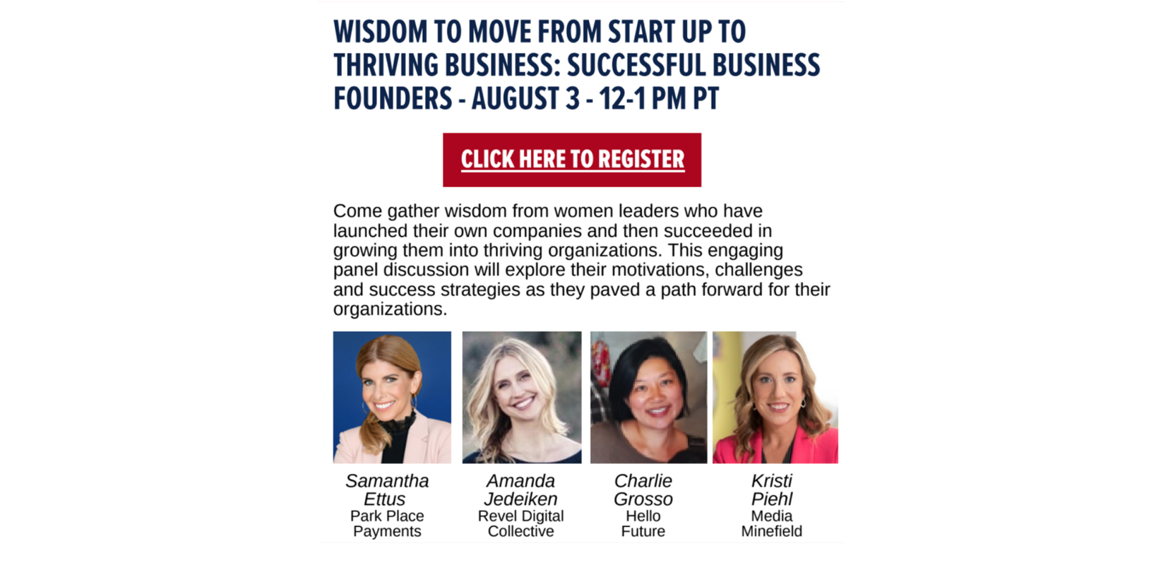 As a highlighted Women’s Leader, she spoke about the transition from a start up to a successful business alongside other female entrepreneurs. Charlie discussed her passion for Hello Future and the ways her past helped shape the vision for its future. The four women discuss obstacles, success, and motivation throughout their careers.